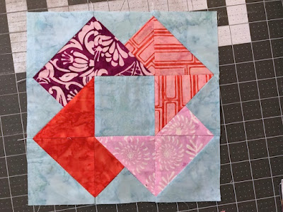 I learned some valuable things with this block.  First of all, Jen Kingwell uses a VERY scant 1/4" seam when making her blocks.  Secondly, if you are using a fabric without a clear right and wrong side (like a batik!) be very careful in putting together the blended HST blocks at the NESW points of the 9-patch.  It's easy to get those pieces reversed if you're not careful!  And this block calls for pieces cut 3 7/8" square for the HSTS - I rounded up to 4" so that I could trim them down to the perfect size.  I've found that it works better to go large and trim down than to risk it coming up a little small.