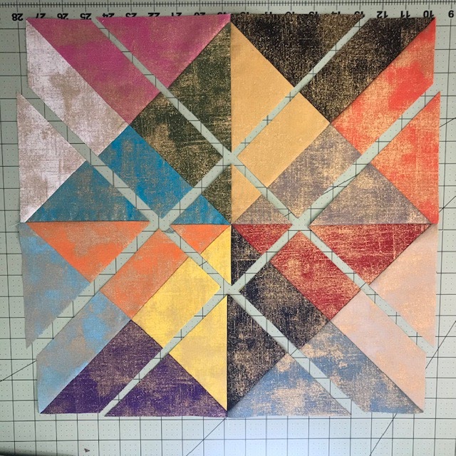 I cut on either side of the diagonal centers, breaking the block into nine patches.