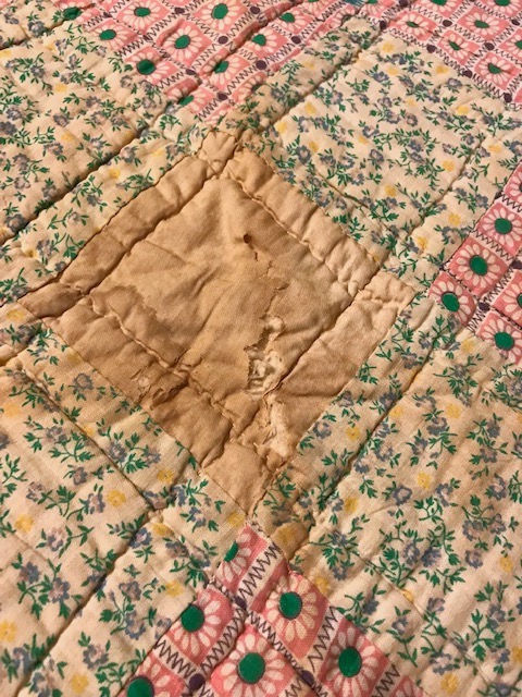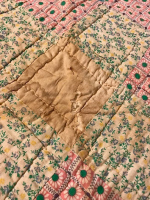 ...which have dried out and worn away on the edges where this quilt was folded up. But wonder of wonders, with some muslin, tea bags, and patience, I can make patches for these blocks that will blend right in and fix the problem! So of course, this quilt had to come home with me.