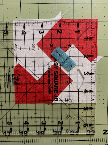 Now for a really important step! Take your block to the cutting mat and lay your ruler on it. You can see here that I lined up the diagonal line with the seam in the 4-patch center, and the 1/4" marks on the side and top with the seam point where the triangles meet. You will trim these two sides of the block, then turn your block 180 degrees and trim the other two sides in the same manner so that there is a 1/4" seam allowance past those points. This will ensure that you don't lose your points in the next round. Lining up the diagonal marking keeps your block square!