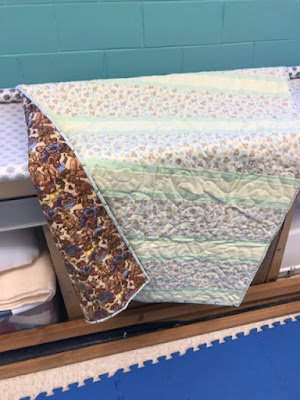 This cute little baby quilt was born! I used all sixteen blocks I made - which made me feel good because the quilt pattern only used fifteen of the sixteen (why did it have me make an extra? I don't know!)